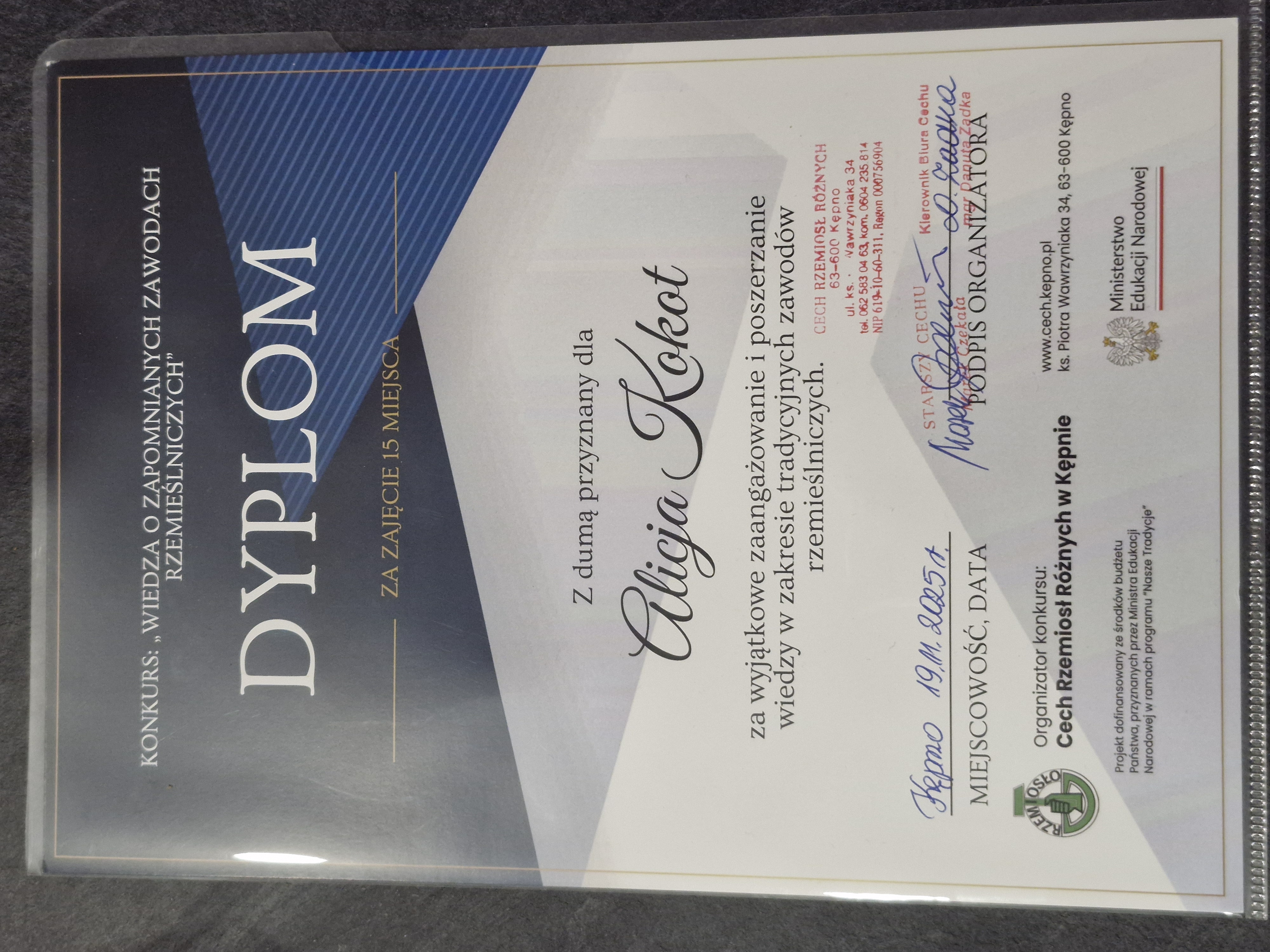 19.11.2025. Nasza uczennica z klasy 8 ALICJA KOKOT zdobyła wyróżnienie w Powiatowym w Konkursie Wiedzy o Zapomnianych Zawodach Rzemieślniczych.Konkurs zorganizował Cech Rzemiosł Różnych w Kępnie.Alicja nagrodę odebrała nieco później, gdyż 19.11.2025 reprezentowała szkołę w zawodach sportowych w Gnieźnie. |
