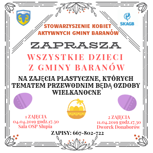 Stowarzyszenie Kobiet Aktywnych zaprasza dzieci i młodzież na zajęcia plastyczne. Szczegóły na plakacie.