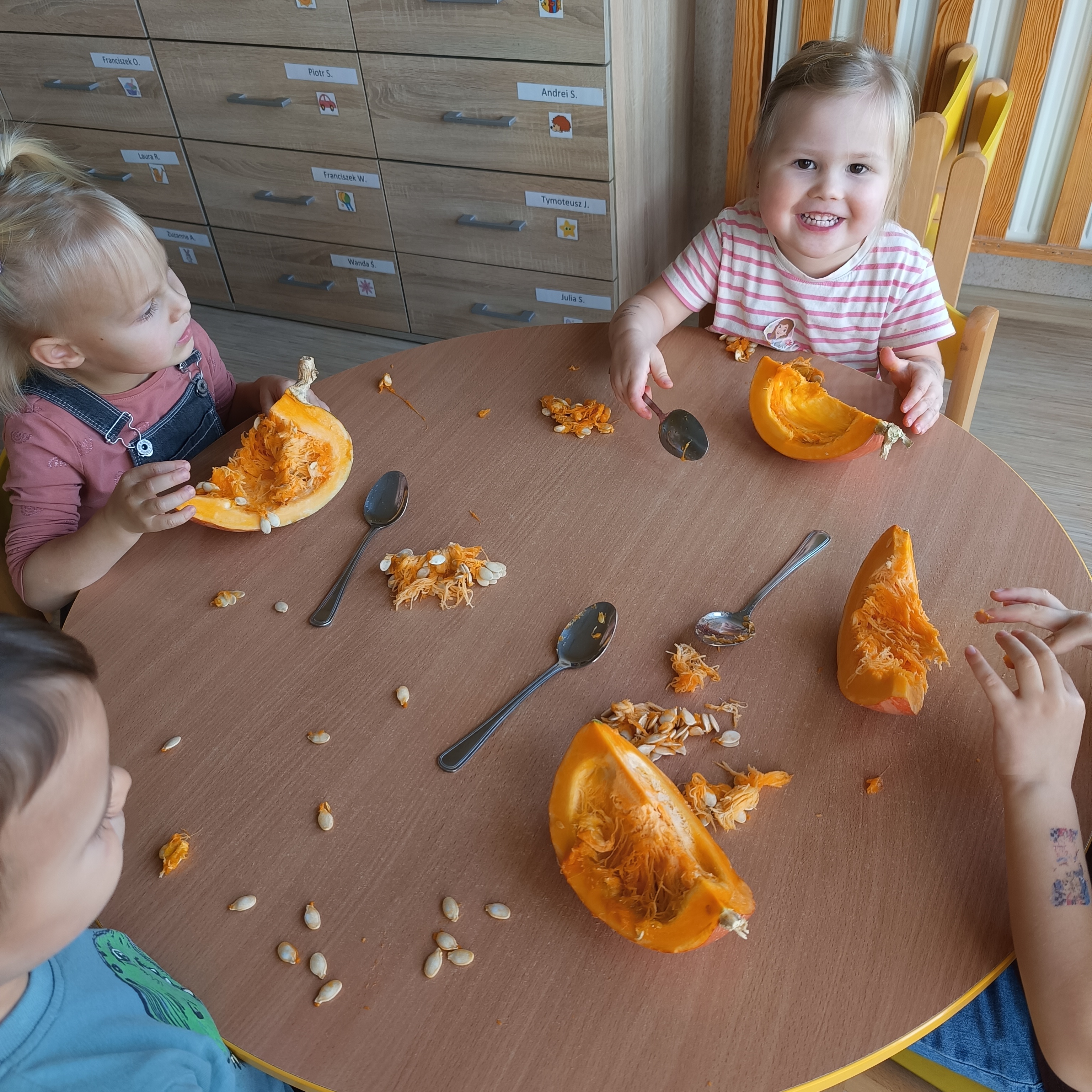W naszym przedszkolu w grupie Krasnoludków obchodziliśmy radosny Dzień Dyni! Tego dnia dzieci przyszły ubrane na pomarańczowo, dzięki czemu w salach zapanował prawdziwie jesienny klimat. Przedszkolaki poznawały różne odmiany dyni, ich właściwości i zastosowanie w kuchni.